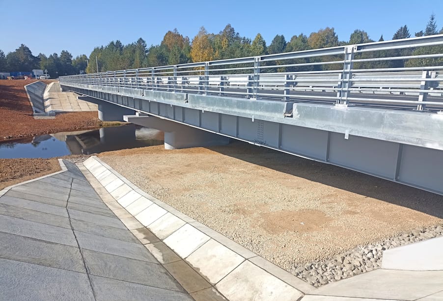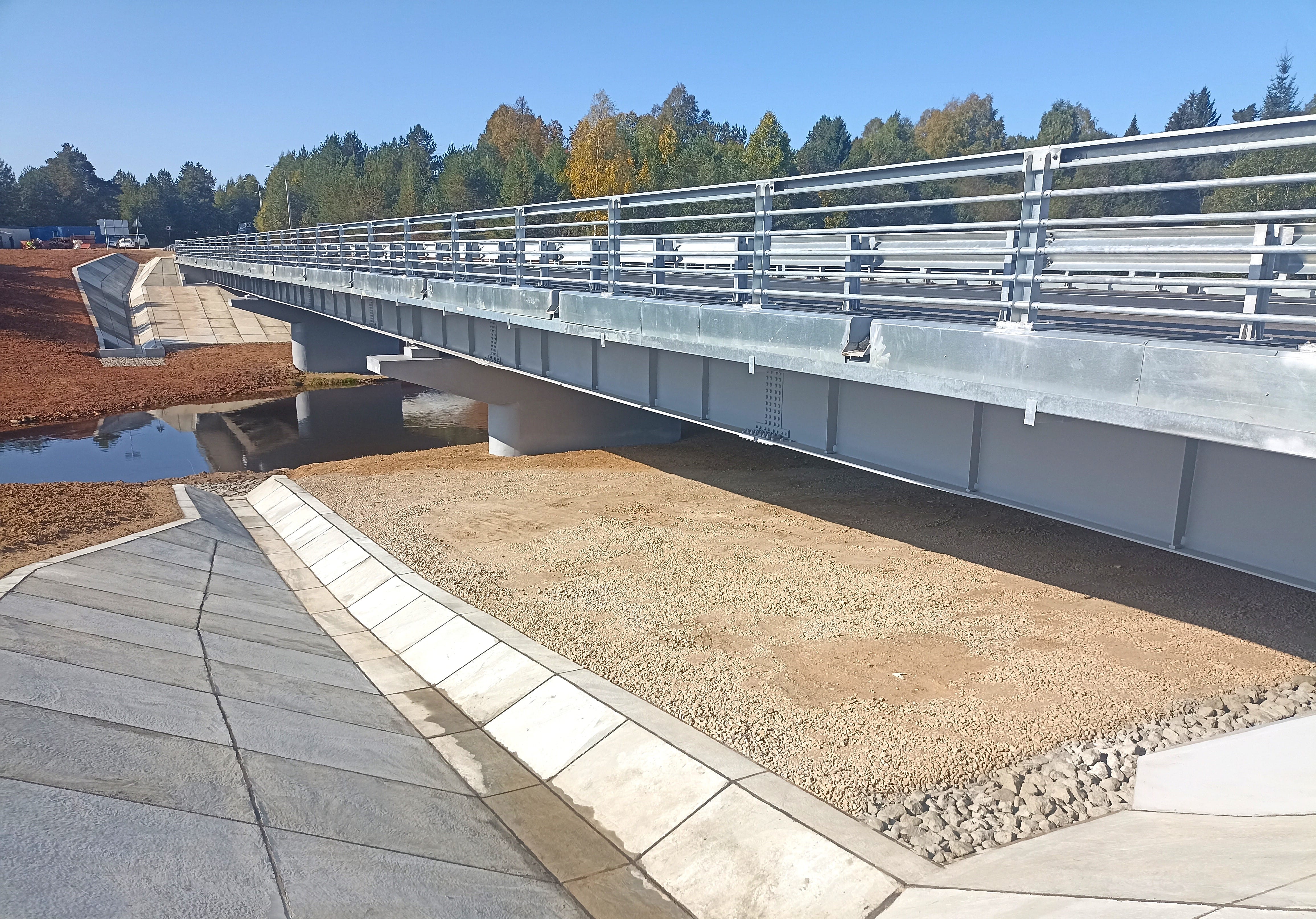Кроме того, выполнили работы по асфальтированию проезжей части и тротуаров, а также покрасочные работы. Установили барьерное и перильное ограждения, дорожные знаки, нанесли разметку.